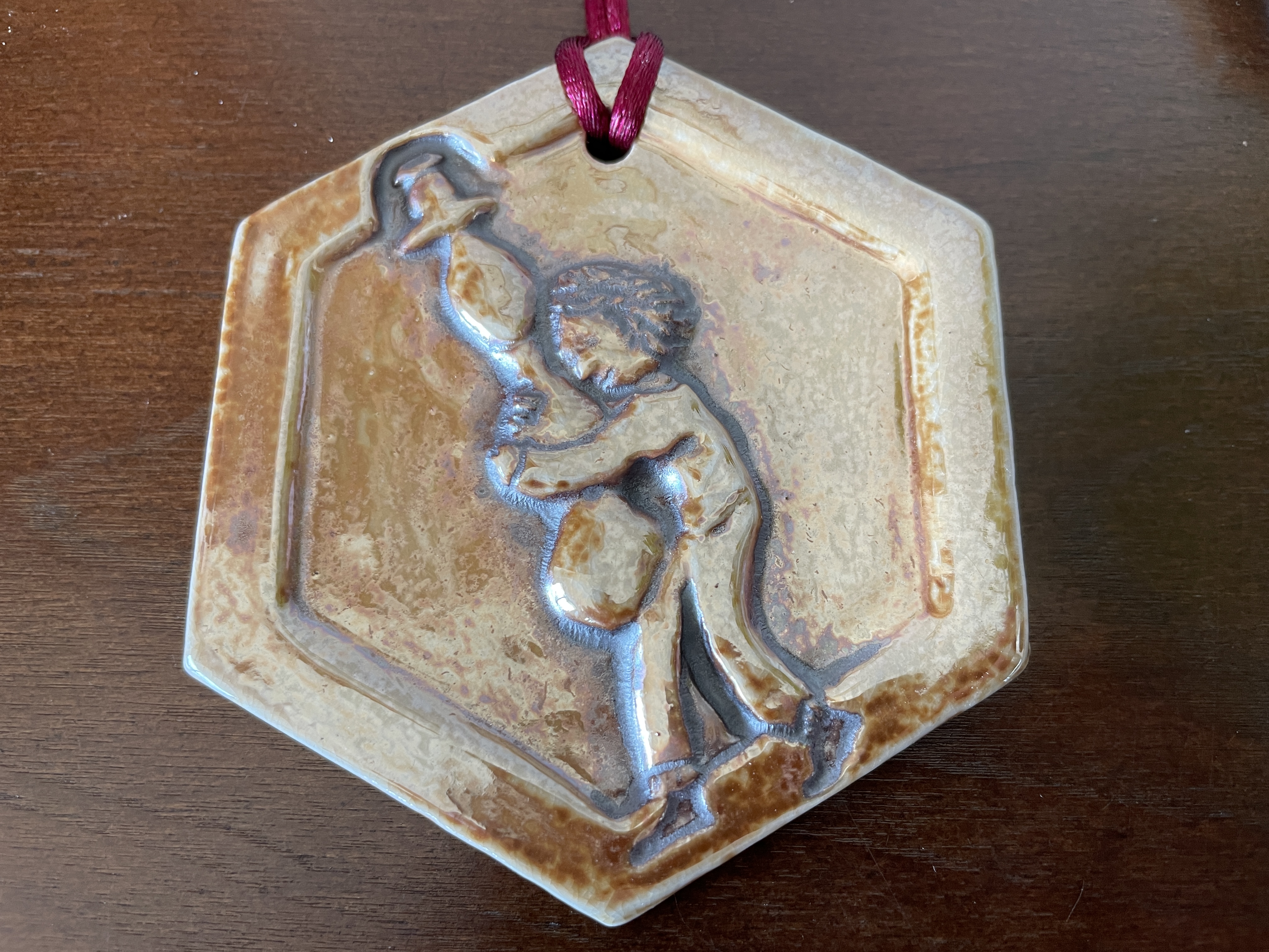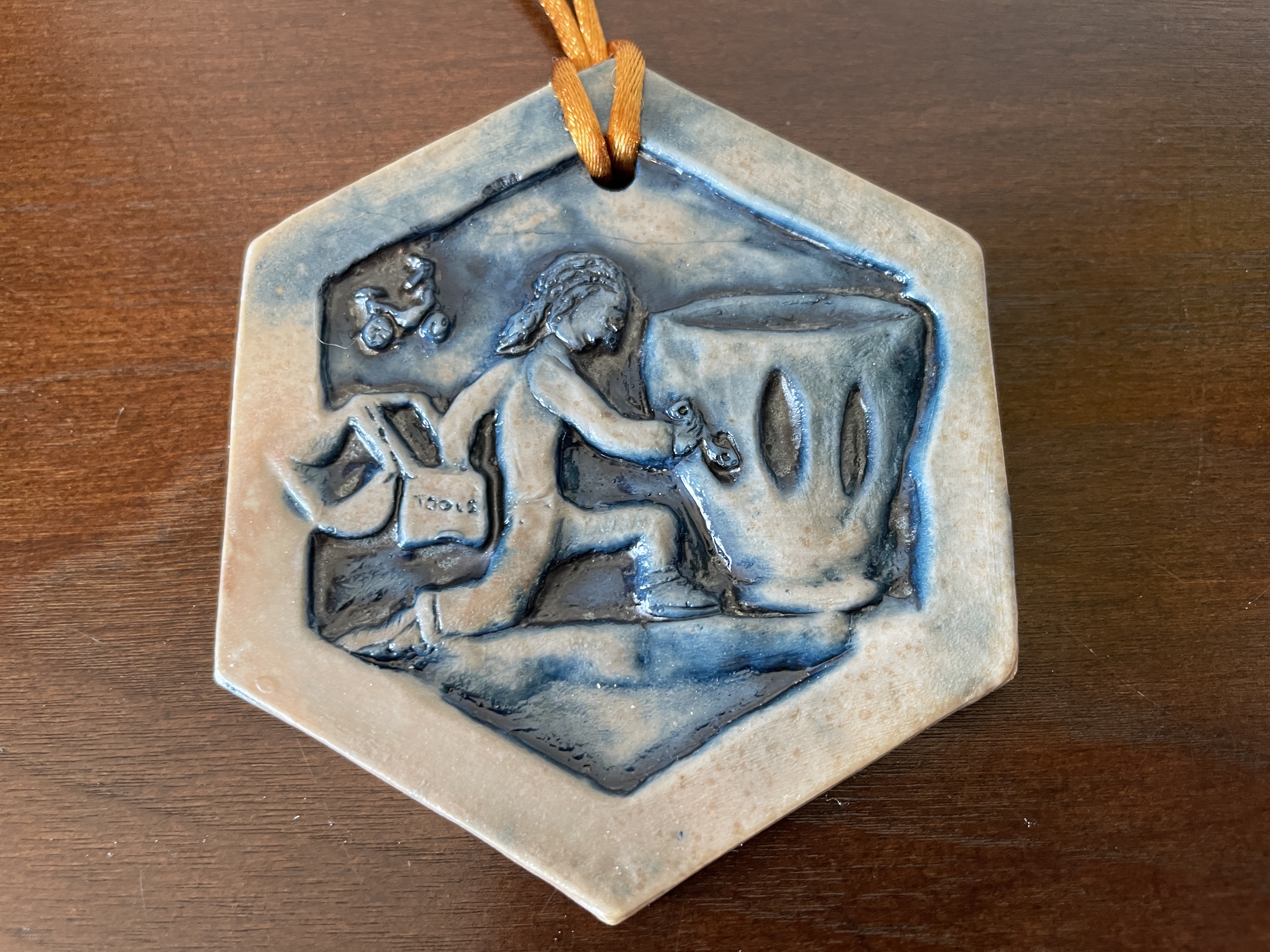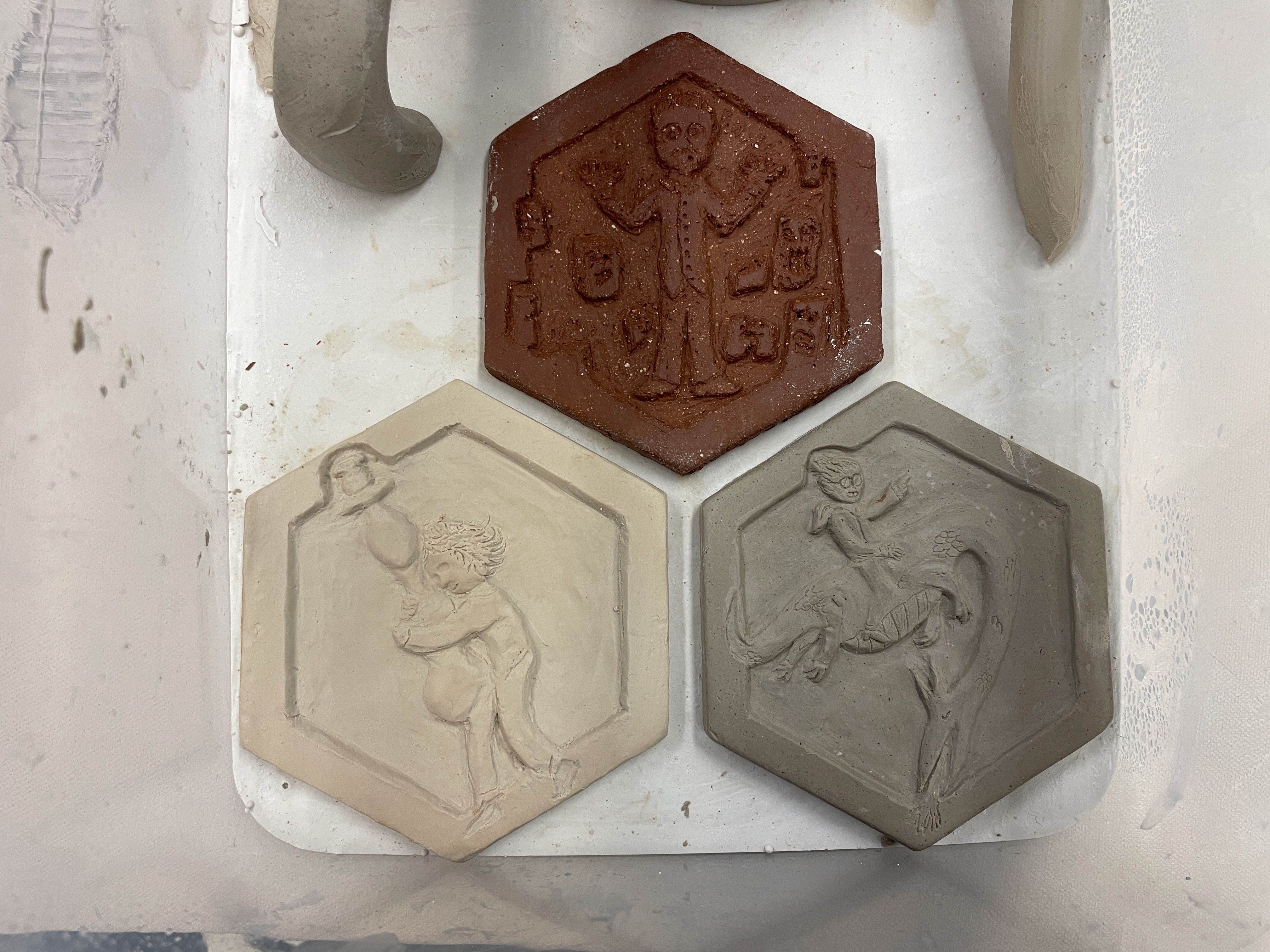 First, I hand carved the tiles and then used to make a reference press-mold. Castings from this mold were then used to create several two-part slipcasting molds, including molds for the half tiles around the perimeter. The tiles were glazed with custom glazes I mixed for this project and then fired to Δ10 in an electric kiln.