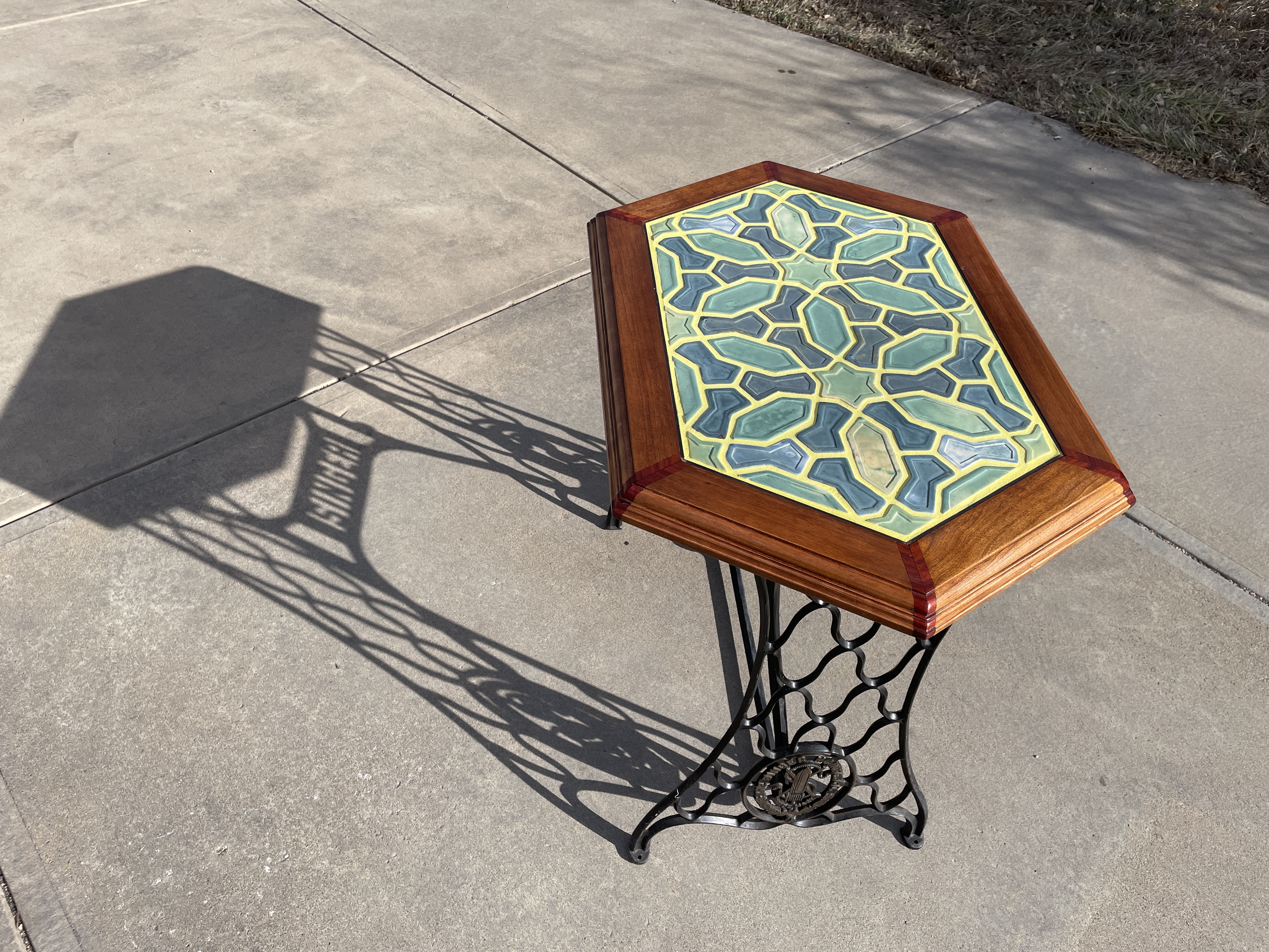 Brass tubing loops around the perimeter of the tiles to provide an outer edge for the grout before it encounters the wood. Using a chemical blackening agent I darkened the brass into subtle shades of blue and green to blend harmoniously. Yellow iron-oxide pigment was added to the grout to grant it its emphasis.