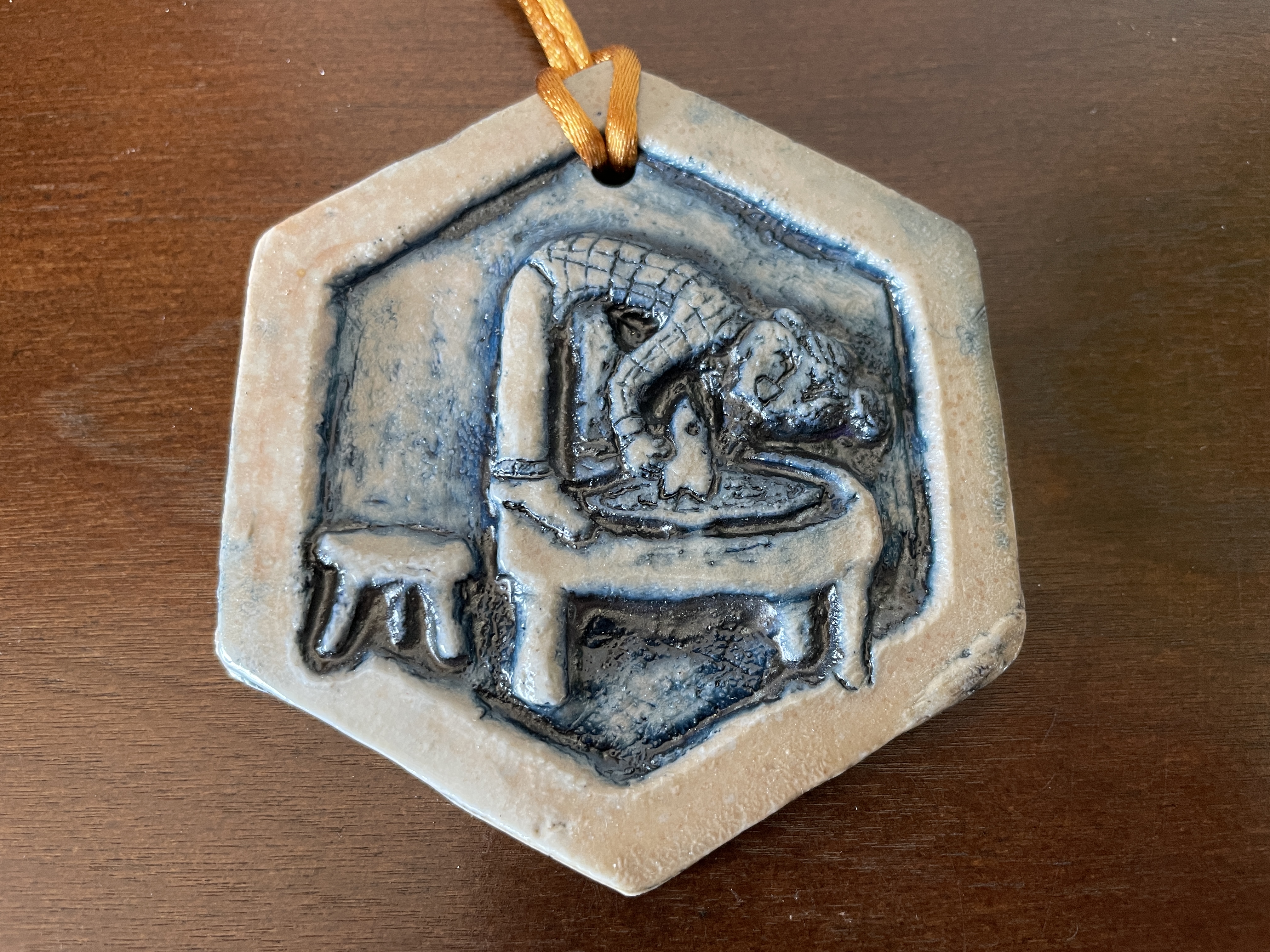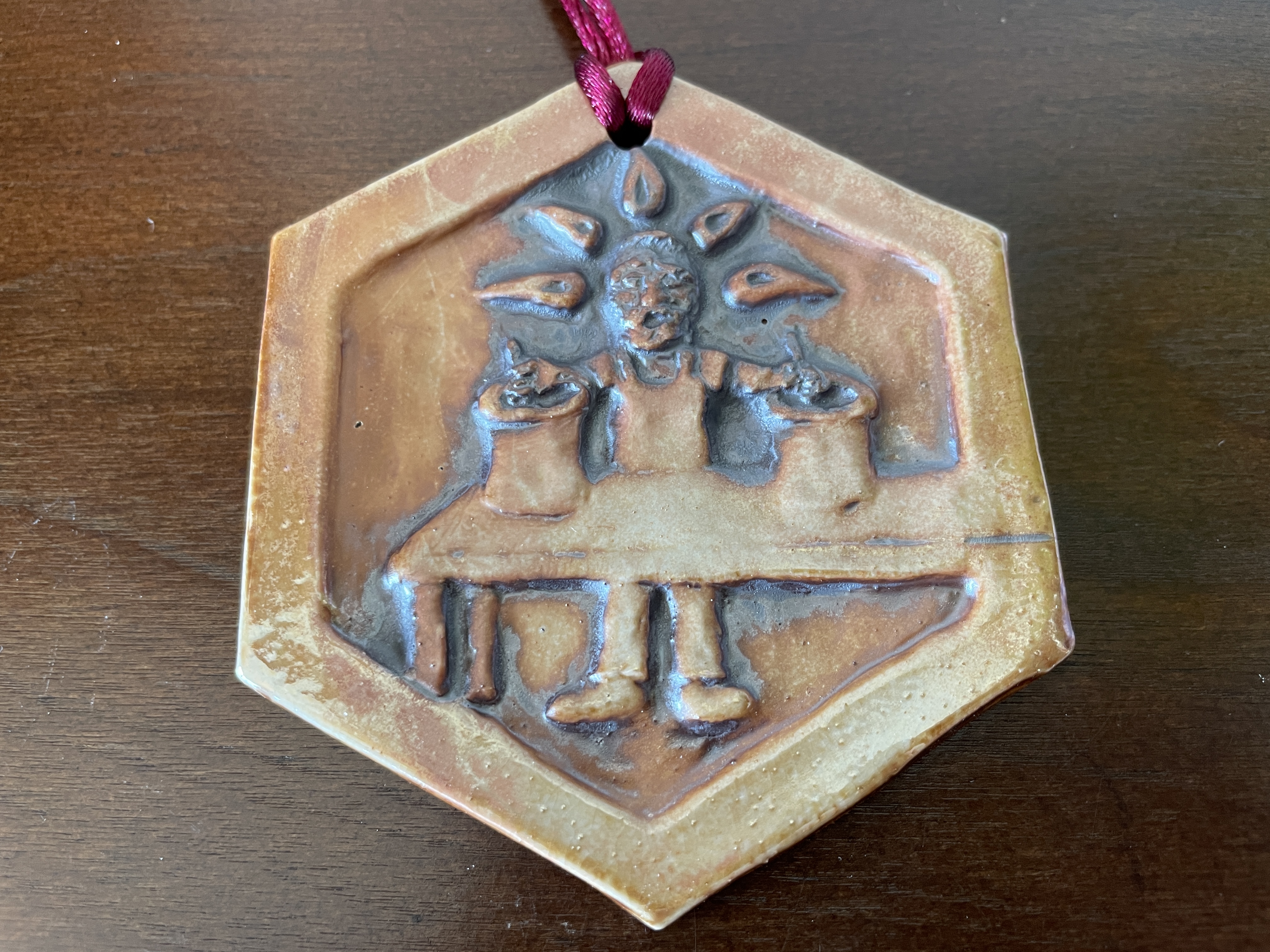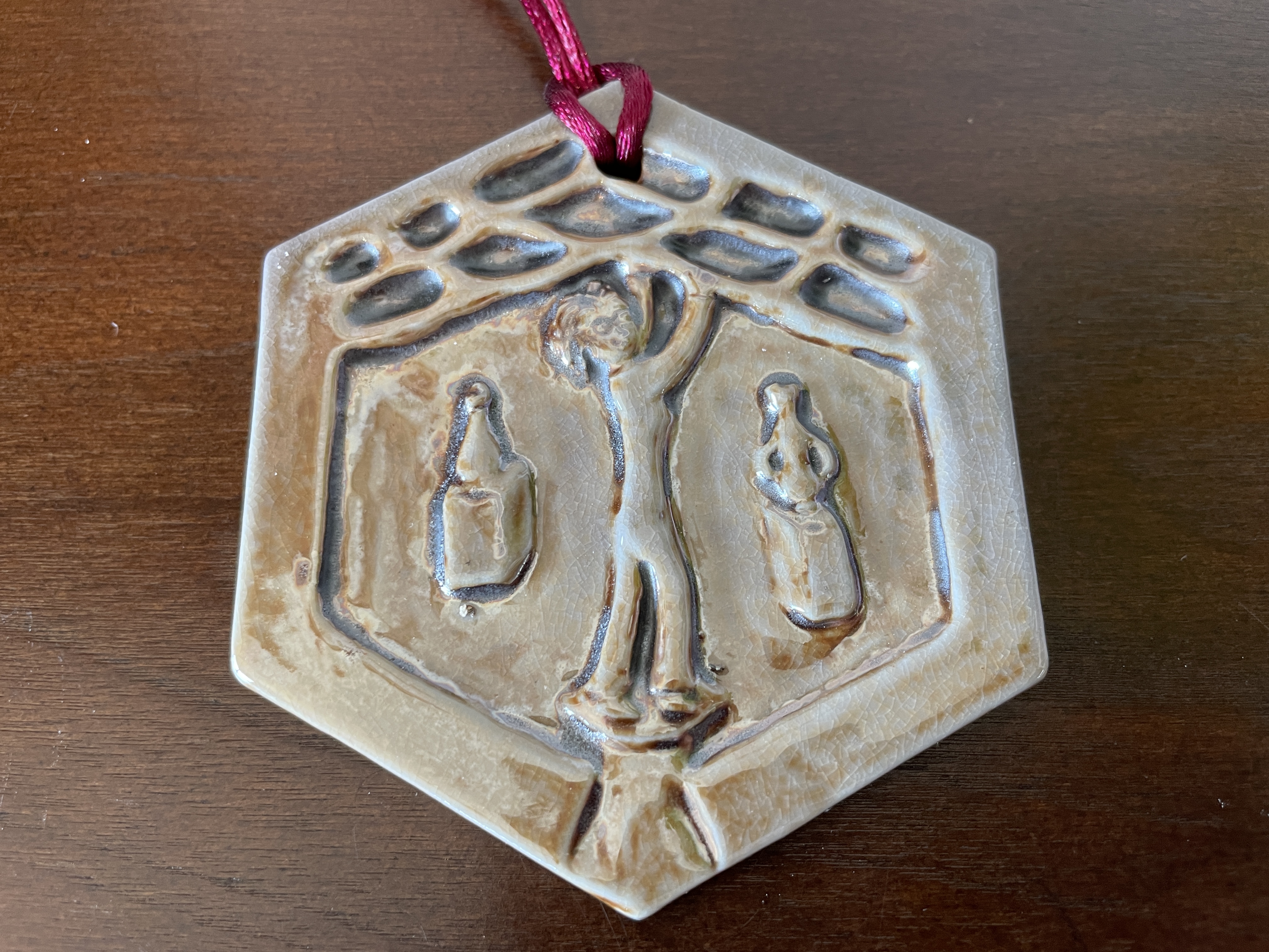 Tiles were hand carved then made into two-part slip casting molds. Examples here were painted with red-iron-oxide and cobalt-oxide wash and fired Δ10 soda. They were drilled with a masonry bit and a hanging cord was added so they could be used as ornaments. The best ones were given away, these are the rest.