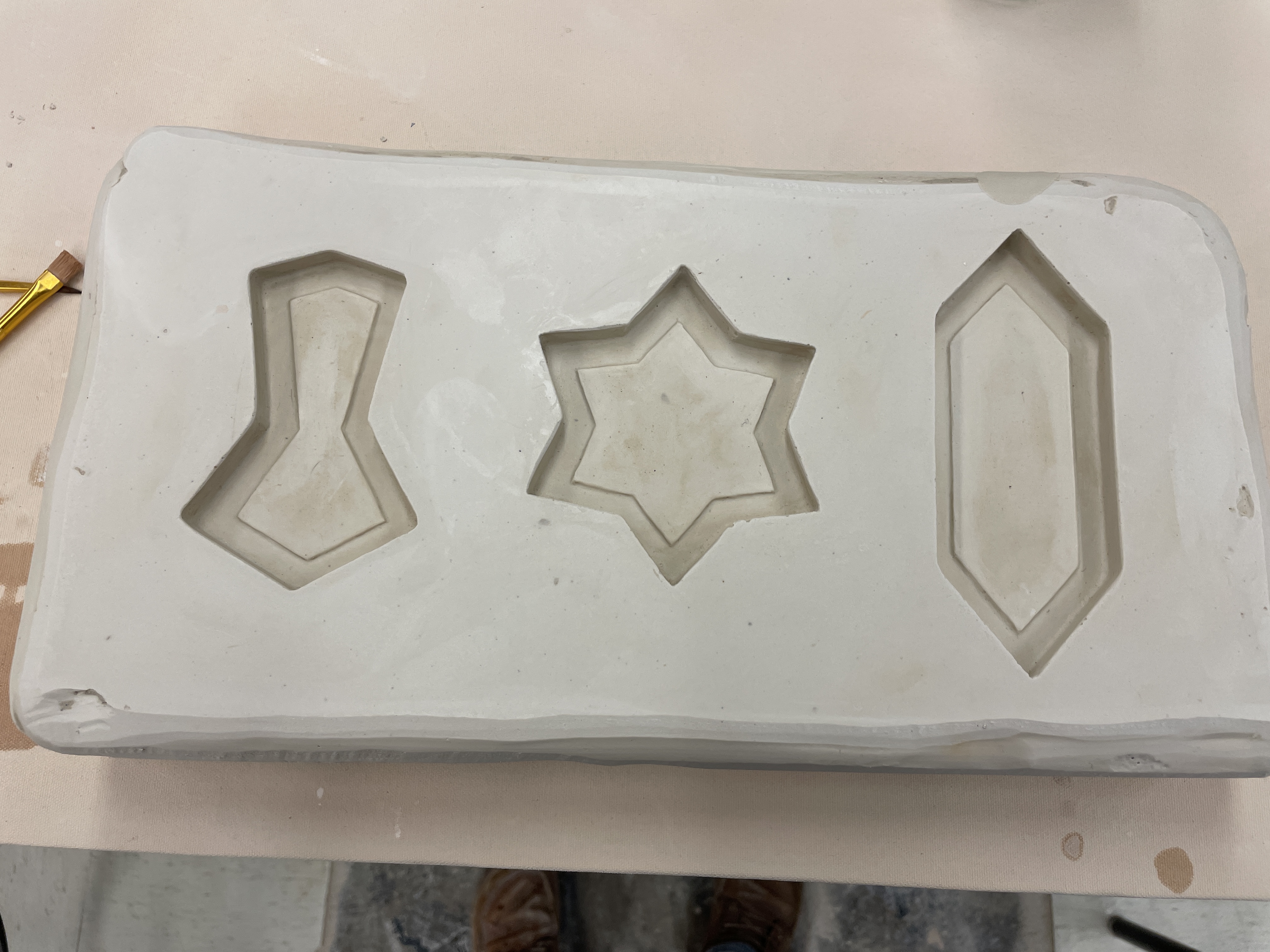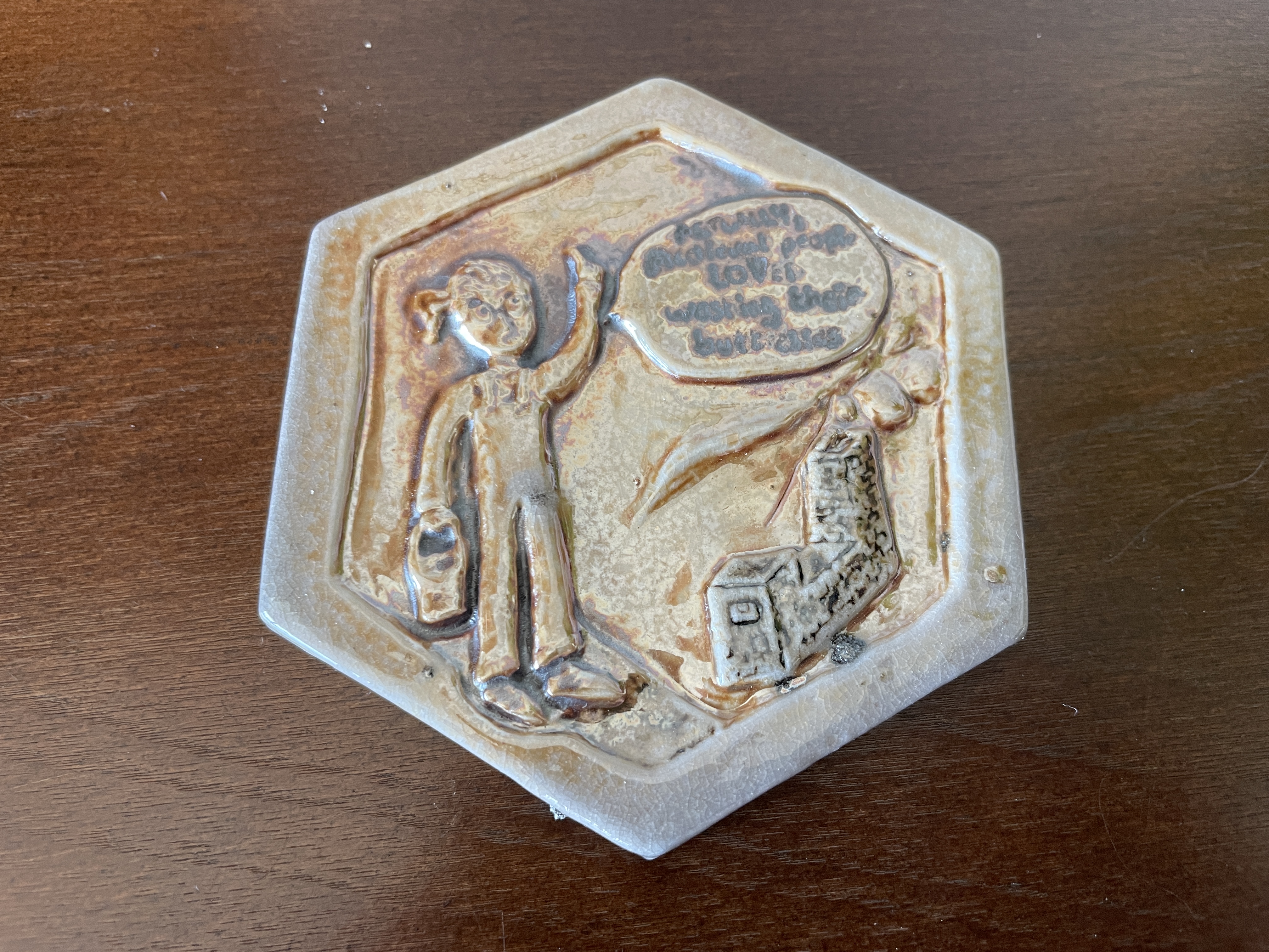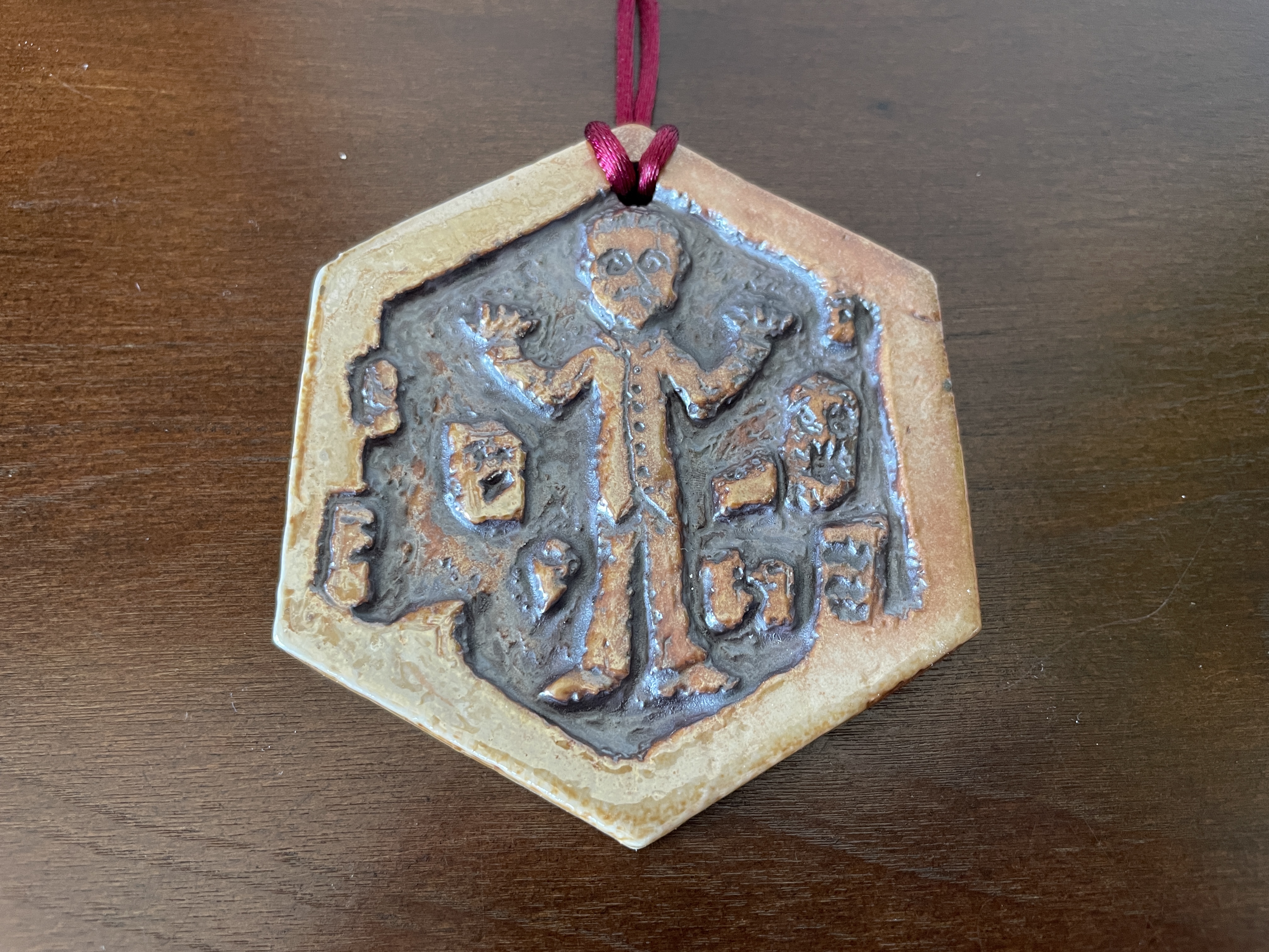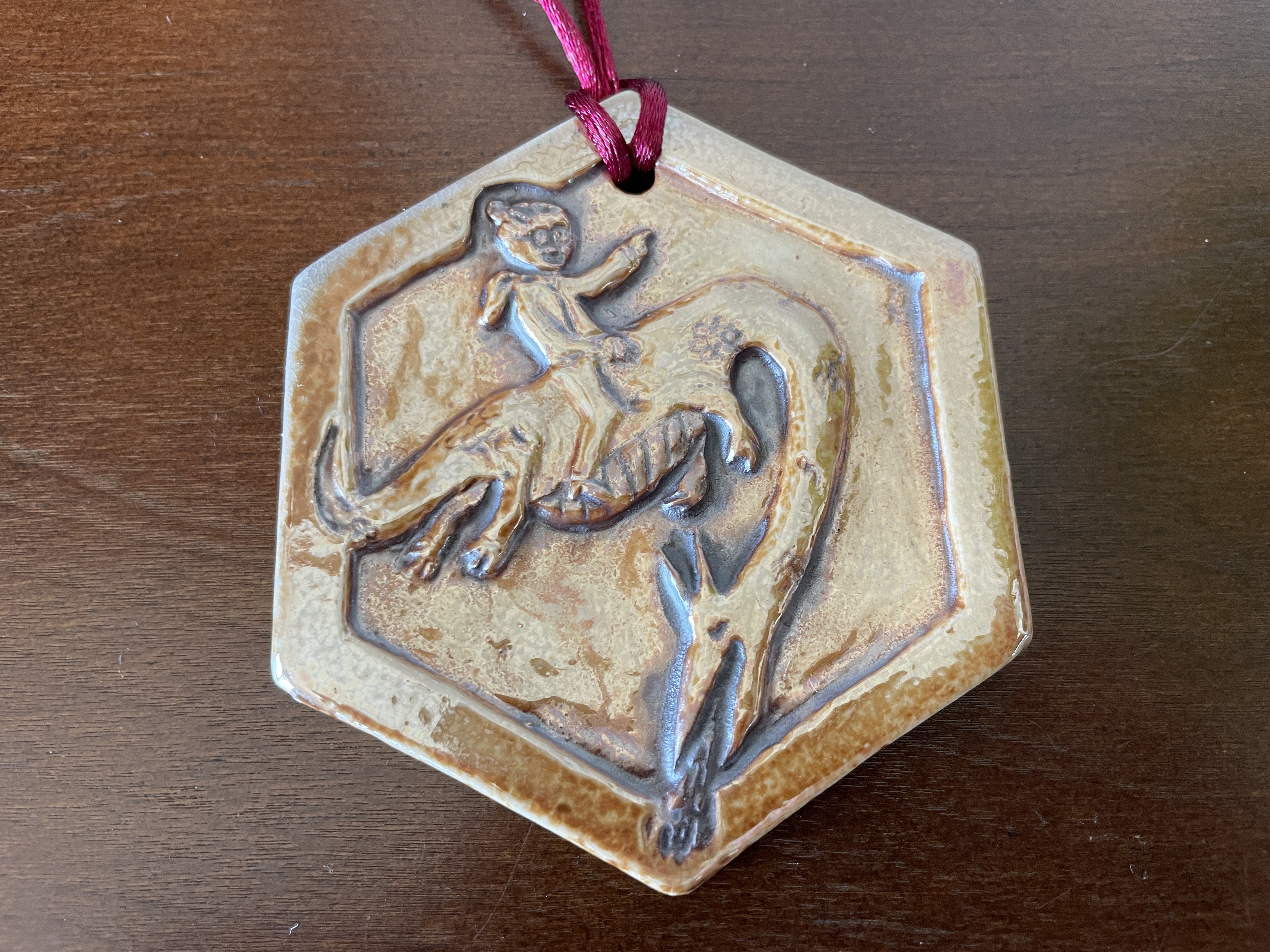 Tiles were hand carved then made into two-part slip casting molds. Examples here were painted with red-iron-oxide and cobalt-oxide wash and fired Δ10 soda. They were drilled with a masonry bit and a hanging cord was added so they could be used as ornaments. The best ones were given away, these are the rest.