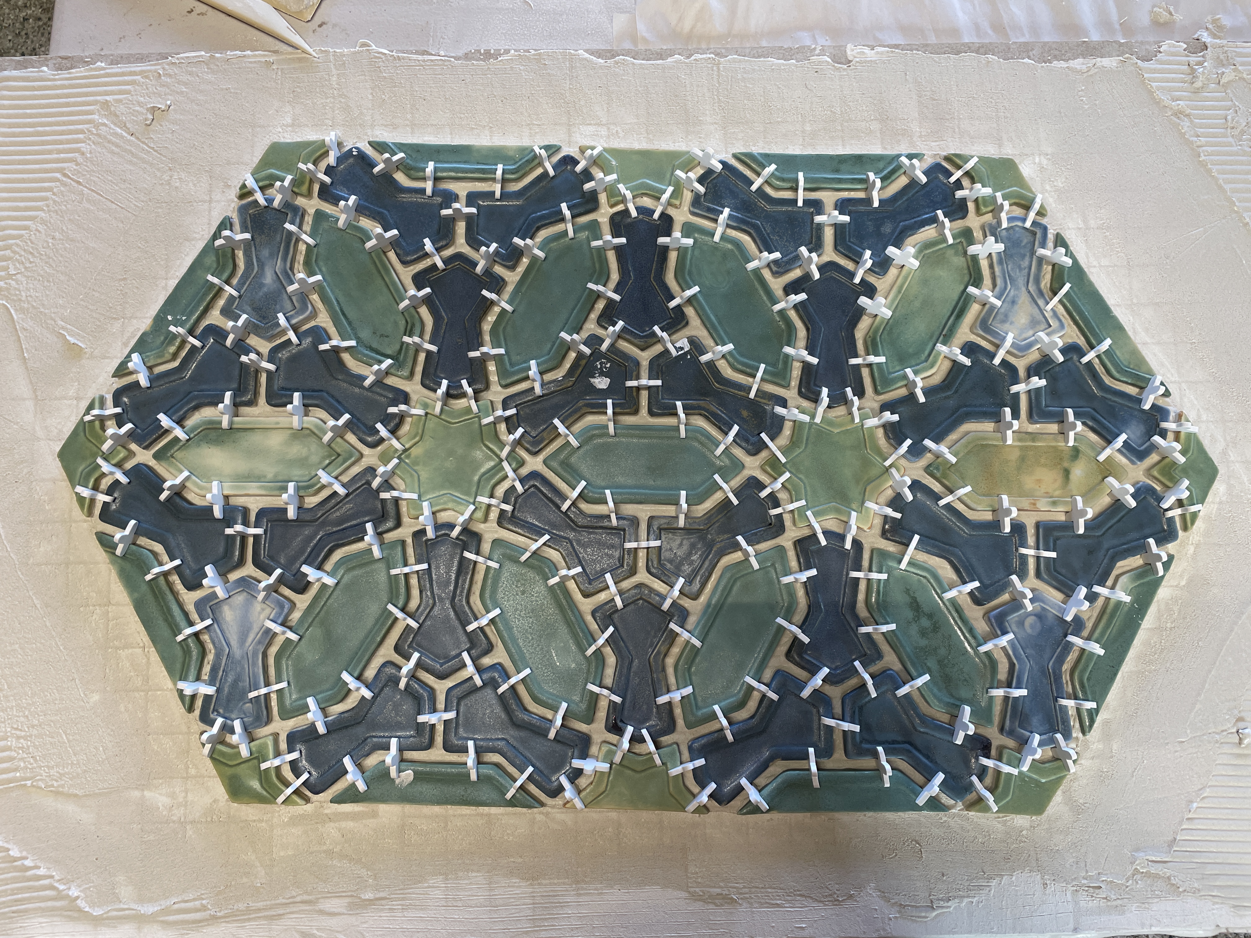 First, I hand carved the tiles and then used to make a reference press-mold. Castings from this mold were then used to create several two-part slipcasting molds, including molds for the half tiles around the perimeter. The tiles were glazed with custom glazes I mixed for this project and then fired to Δ10 in an electric kiln.