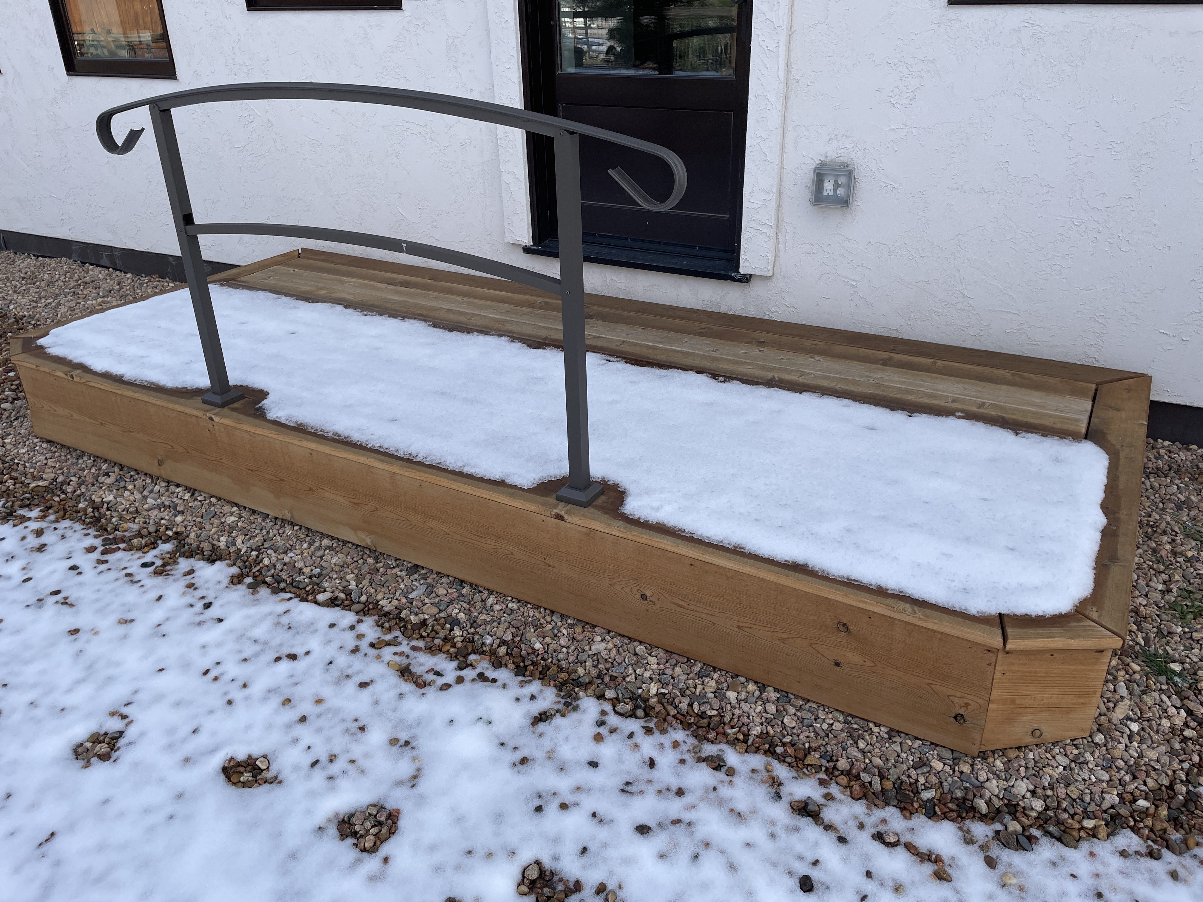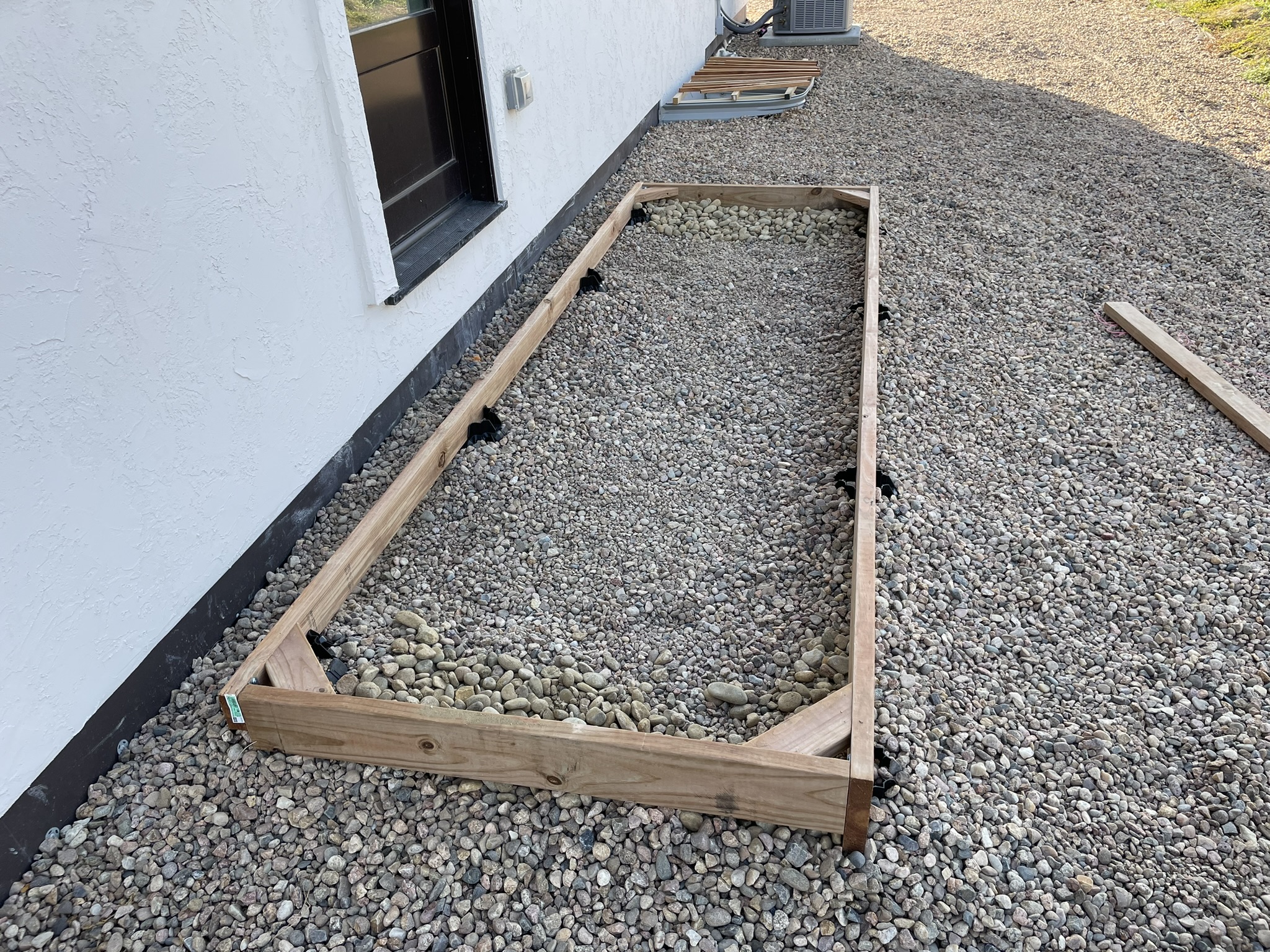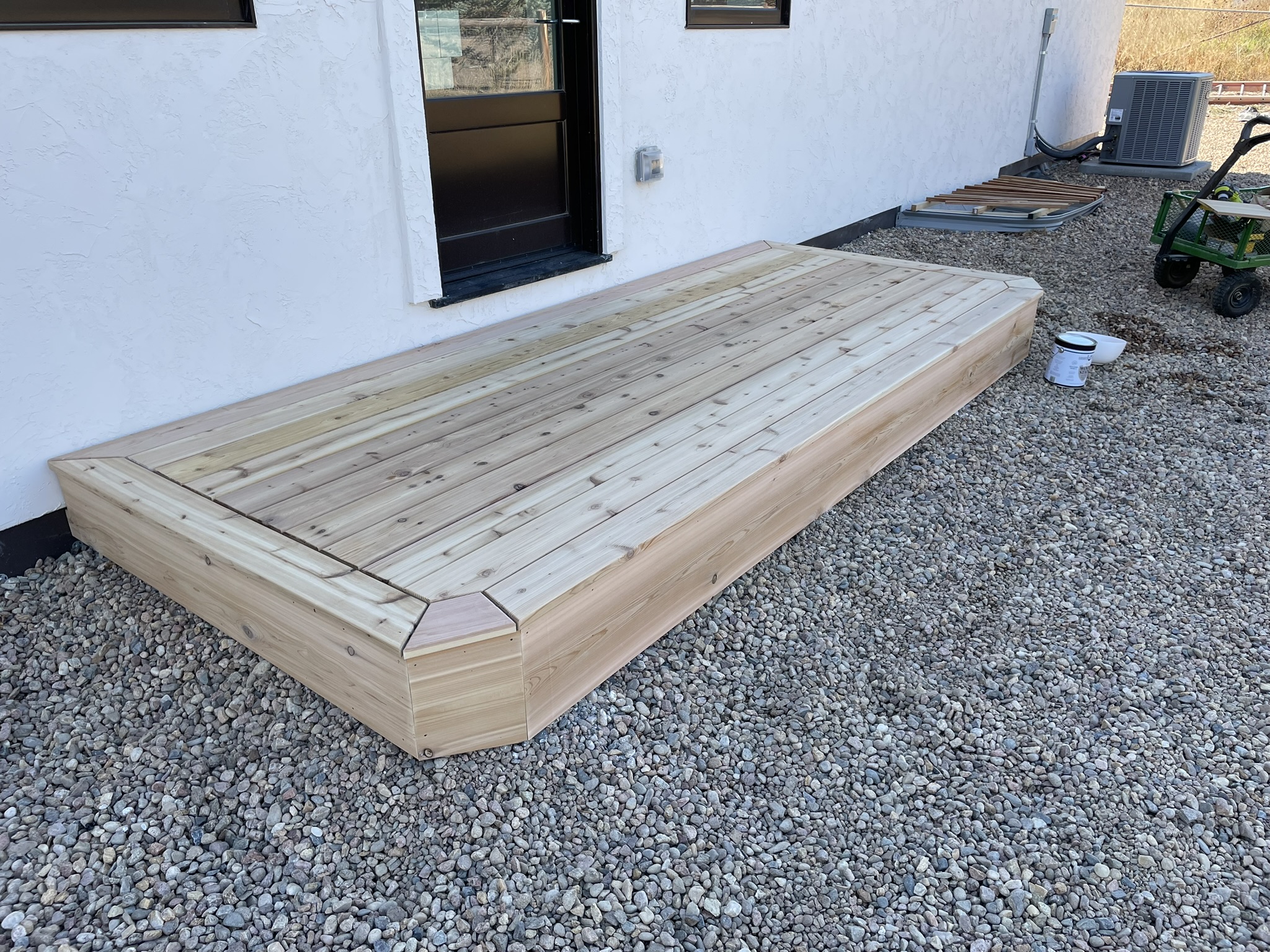 This deck was build off a bedroom and sized to the maximum allowed without a permit. Normally hidden fasteners are reserved for synthetic decking products, but I routed the side-grooves into the planks and it works wonderfully. It is stabilized on plastic boots set into gravel.