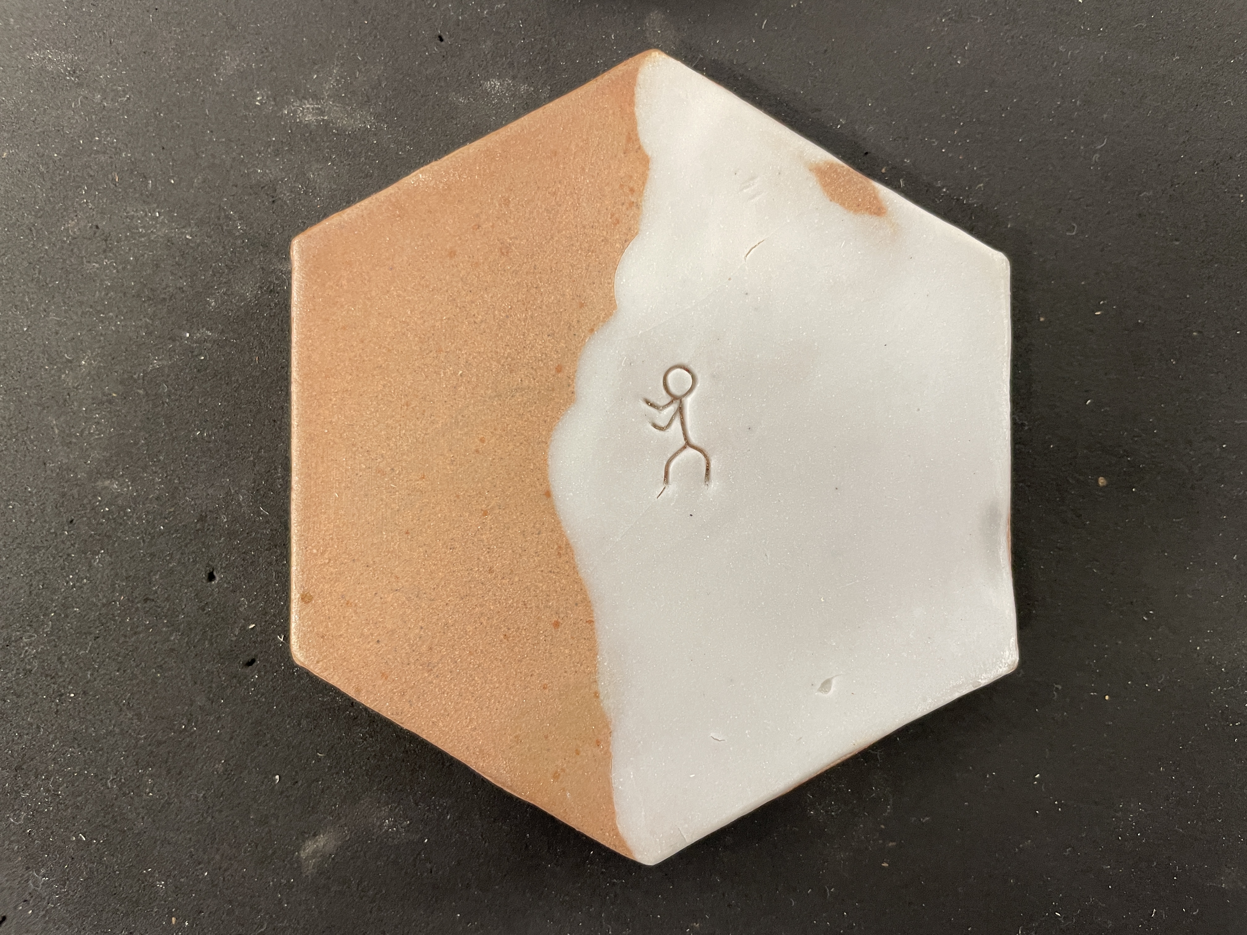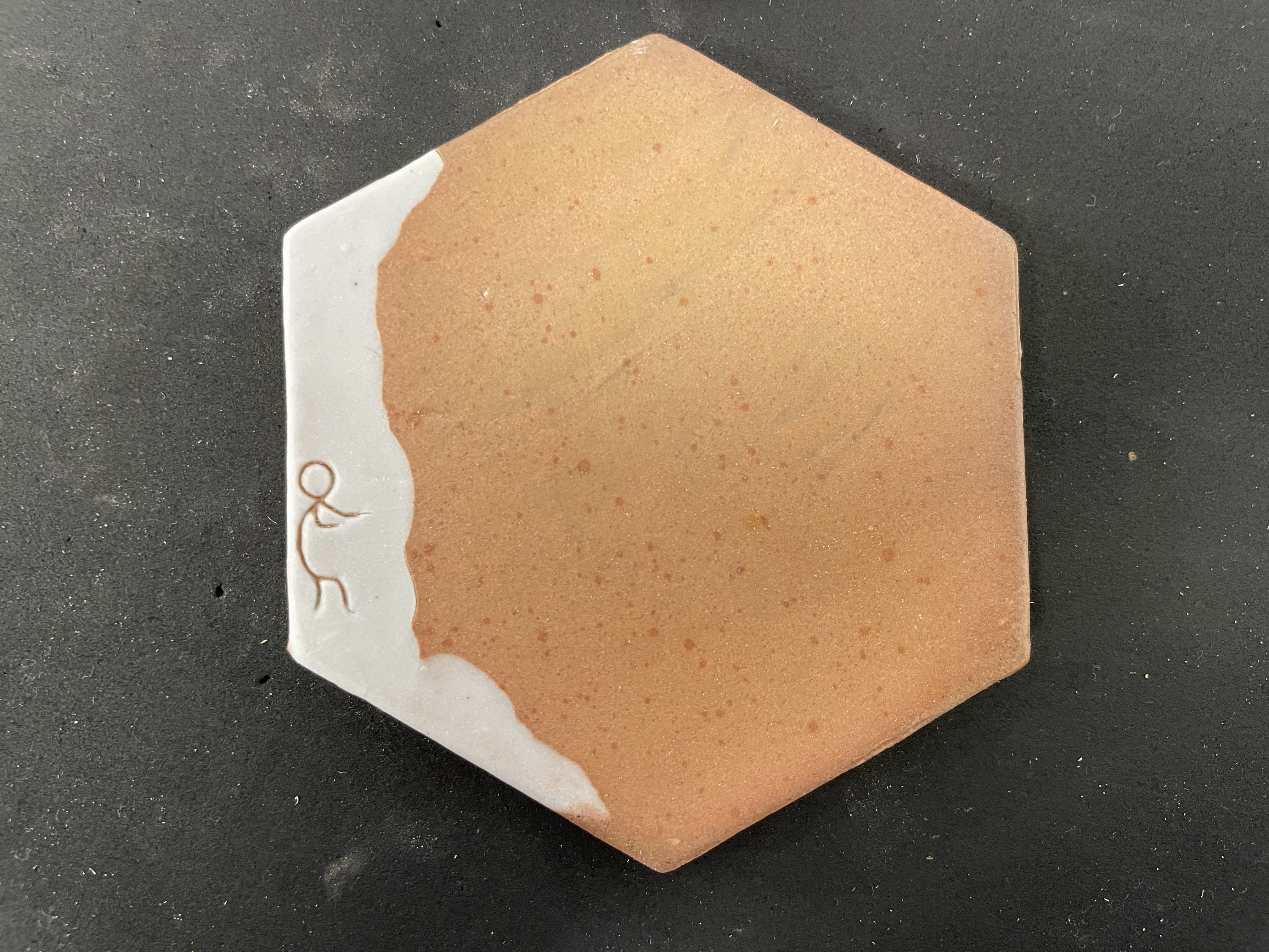 Stoneware and porcelain slip were cast in layers to form the brown and white of the base tiles. Stick figure gesture carvings were used to highlight the body dynamics of the different emotions. The tiles were finished in a Δ6 soda firing.