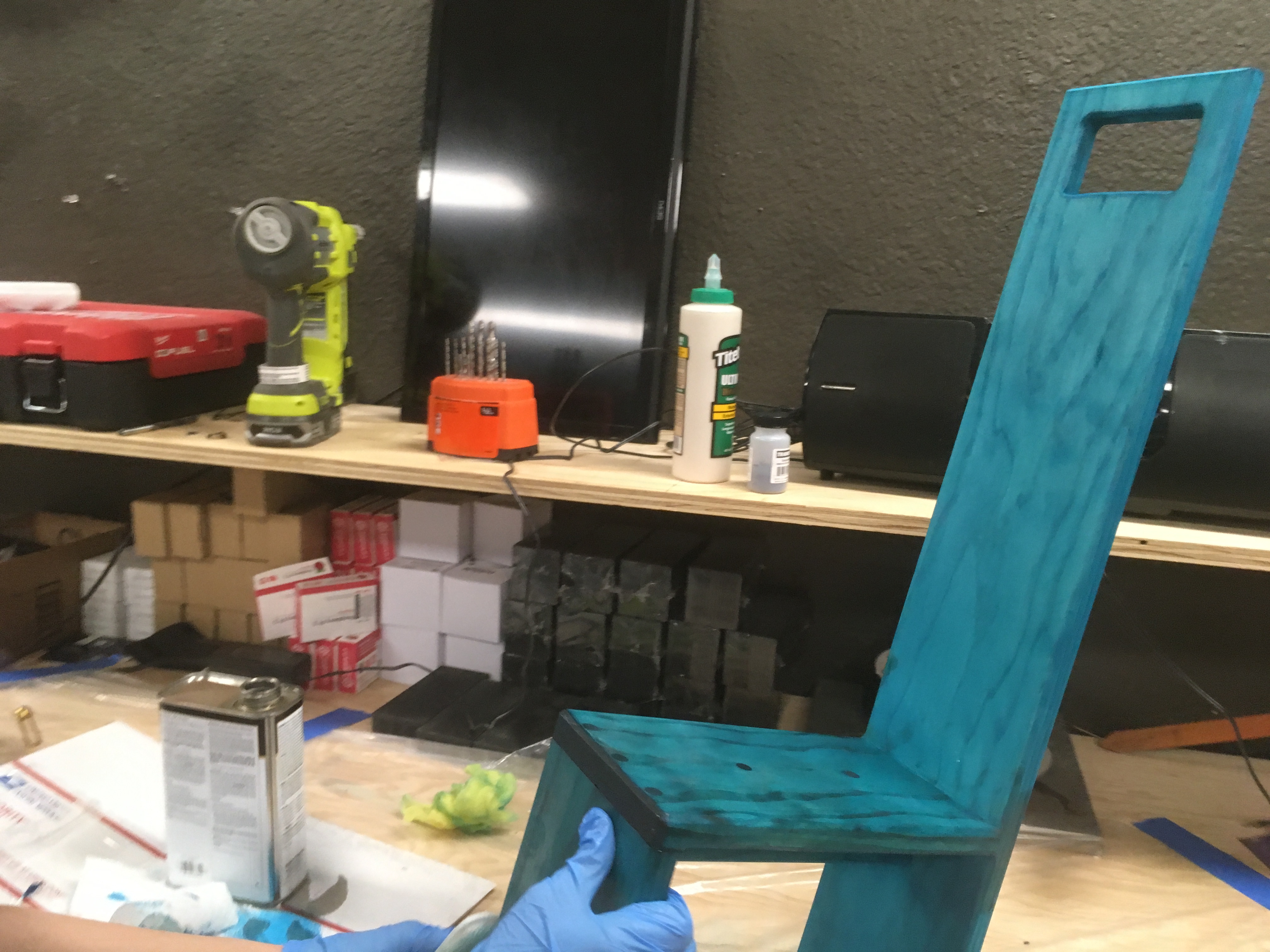 The stool is made of lightweight pine and the handle puts it at a comfortable height for grabbing and carrying. It features flush-cut through-dowel construction and turquoise dyed finish